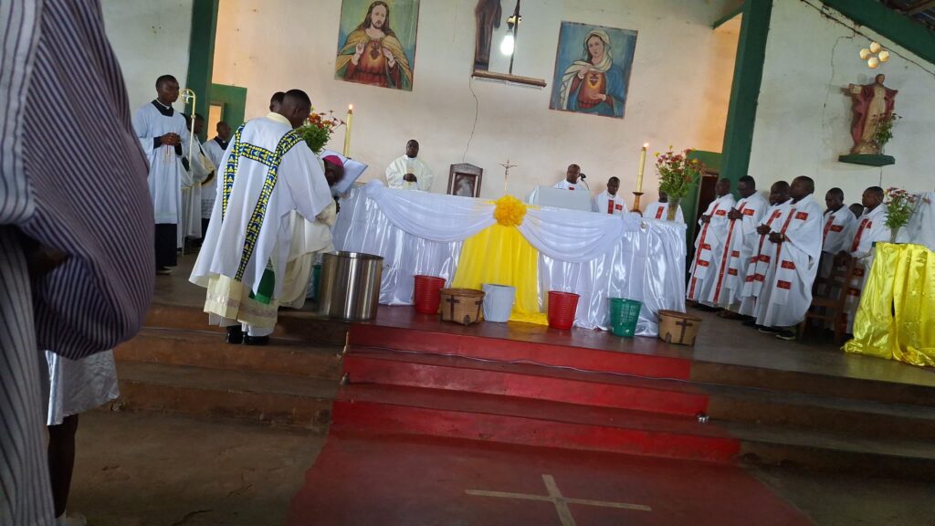 Les fidèles, étant suffisamment sensibilisés, ont répondu nombreux à cet appel et se sont dirigés de bonne heure à l’endroit prévu pour le début du Pèlerinage. C’est devant la Chapelle St Charles Lwanga qu’ont été célébrés les rites d’introduction. L’Evêque entouré des prêtres, des diacres et des autres ministres a exhorté les fidèles en expliquant le sens de l’événement célébré. Après l’exhortation et la prière, un diacre a lu un passage de l’Evangile ; puis suivra la lecture de quelques paragraphes de la bulle d’induction de ce jubilé, Spes non confundit, par un grand séminariste stagiaire.